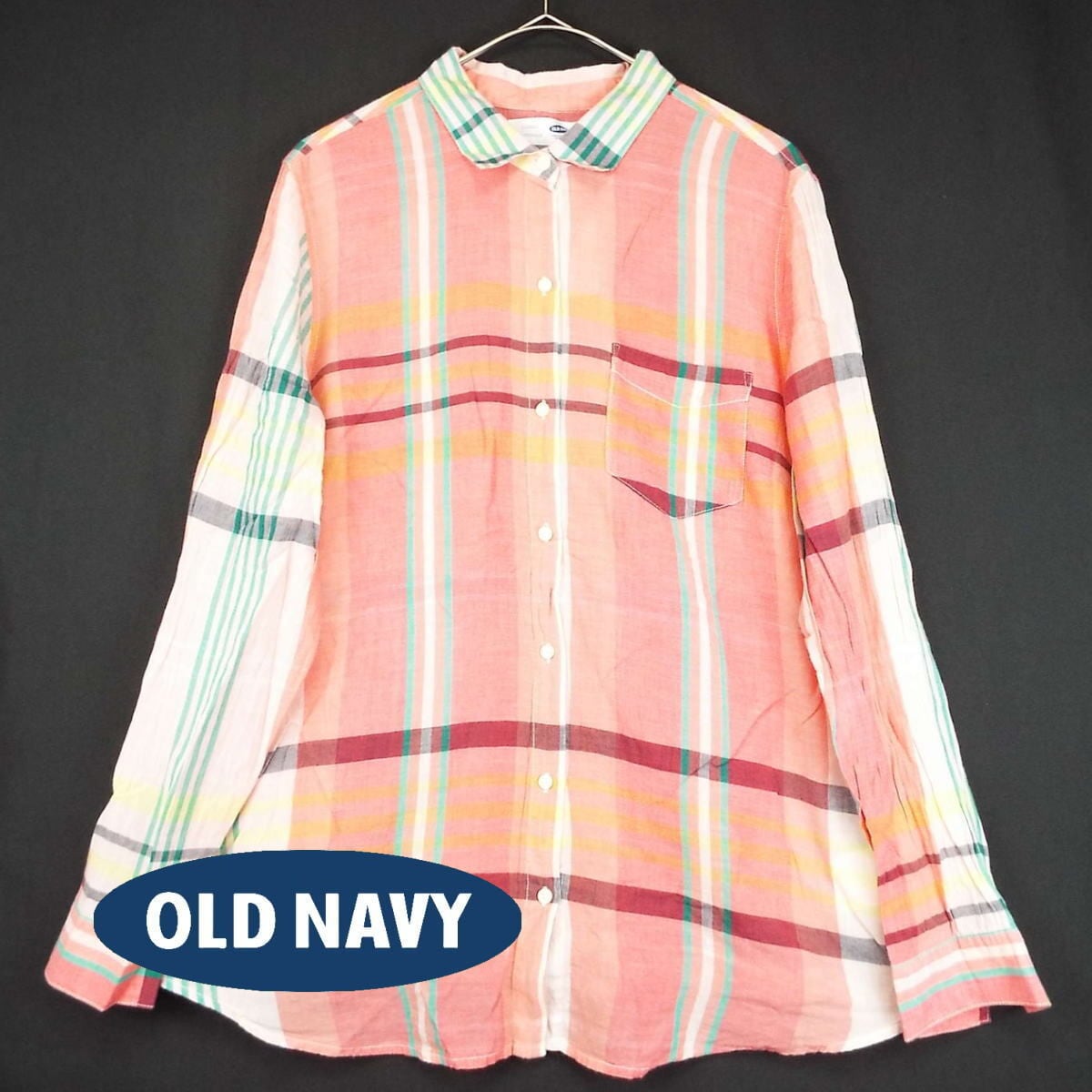 【アメリカ古着】【肩幅42cm】OLD NAVY CLASSIC オールドネイビークラッシック マドラスチェック柄 長袖シャツ Lサイズ(165/100)コットン100% ホワイト・ピンク・グリーン【湘南倉庫】レディースブランド古着 大きいサイズ