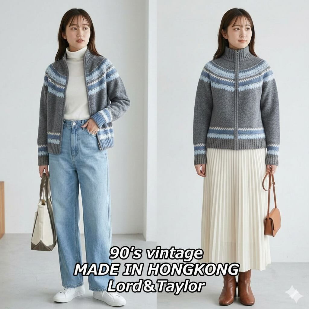 【アメリカ古着】【90年代】 香港製 Lord&Taylor ノルディック柄 フルジップ 長袖ニットセーター ラムウール100% Mサイズ グレーブルー灰青【湘南倉庫】レディース古着 4912345010568