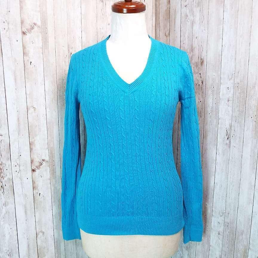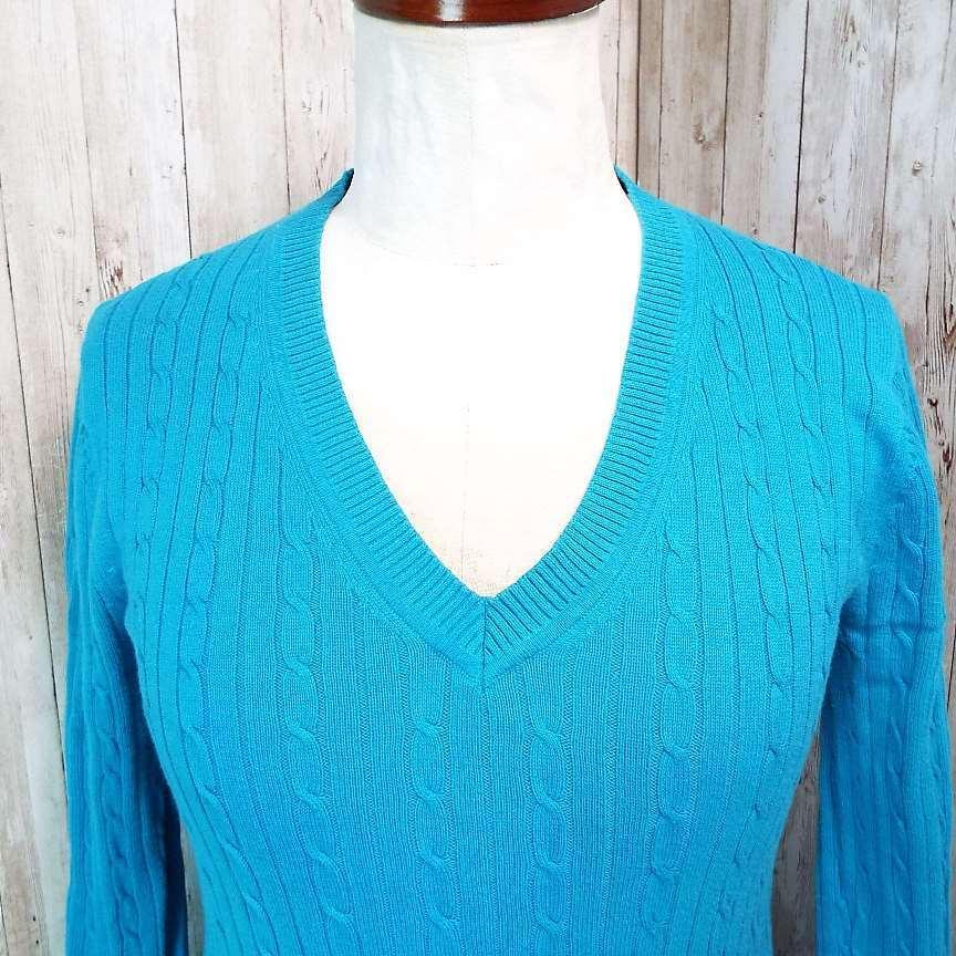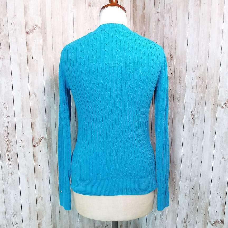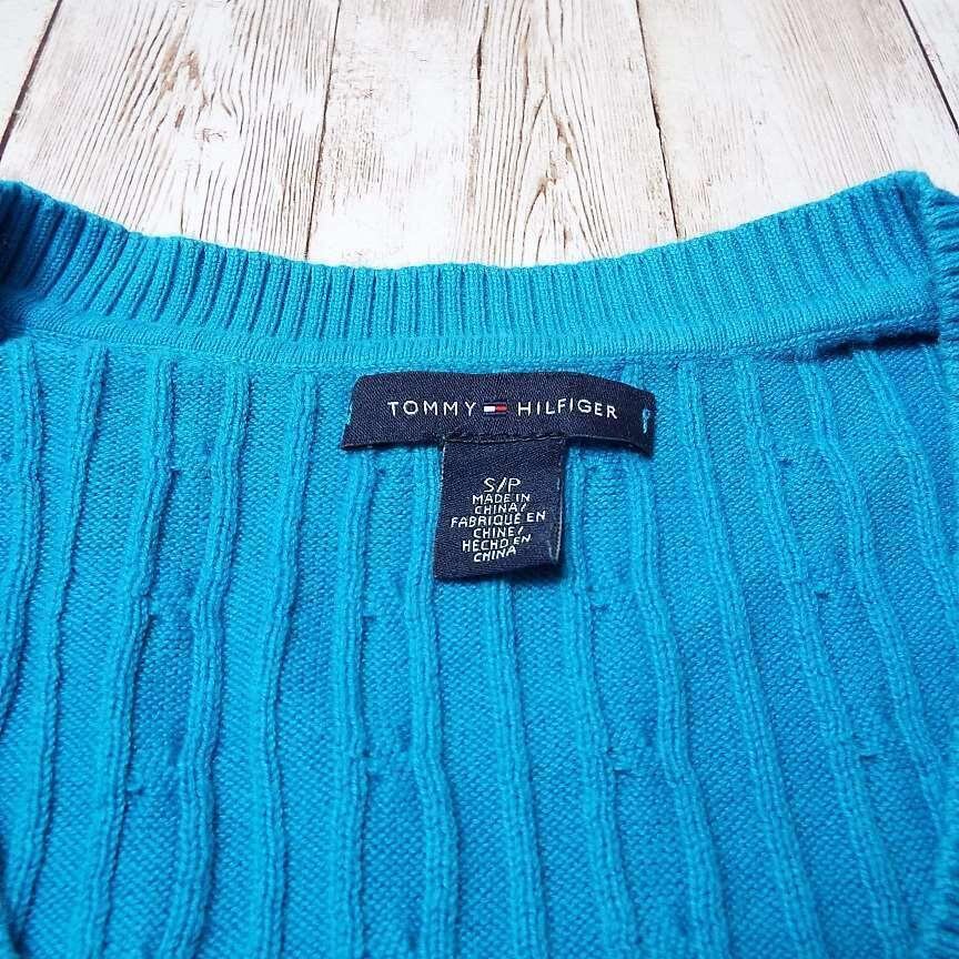 【アメリカ古着】TOMMY HILFIGER トミーヒルフィガー Vネック 長袖ニット セーター Sサイズ(肩幅34cm) ターコイズブルー コットン100%【湘南倉庫】レディースブランド古着