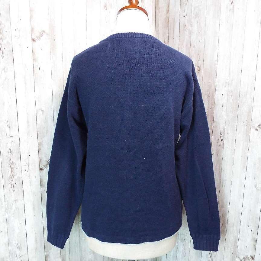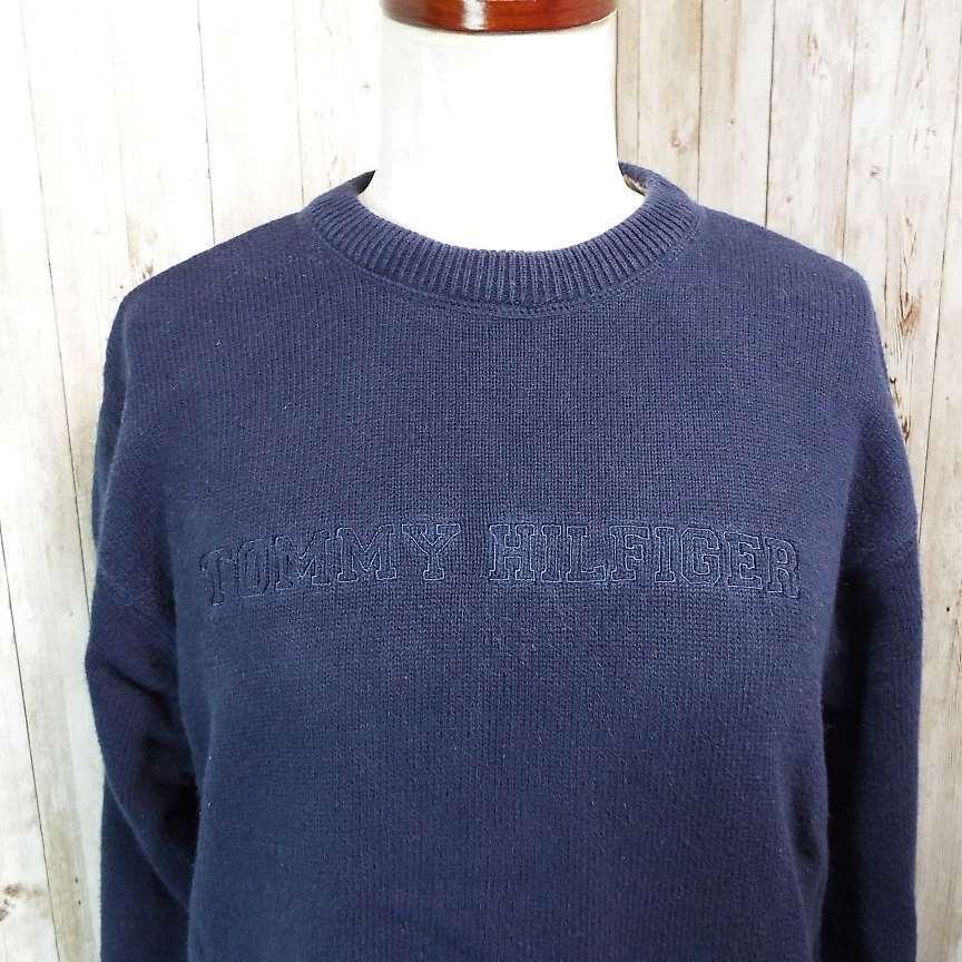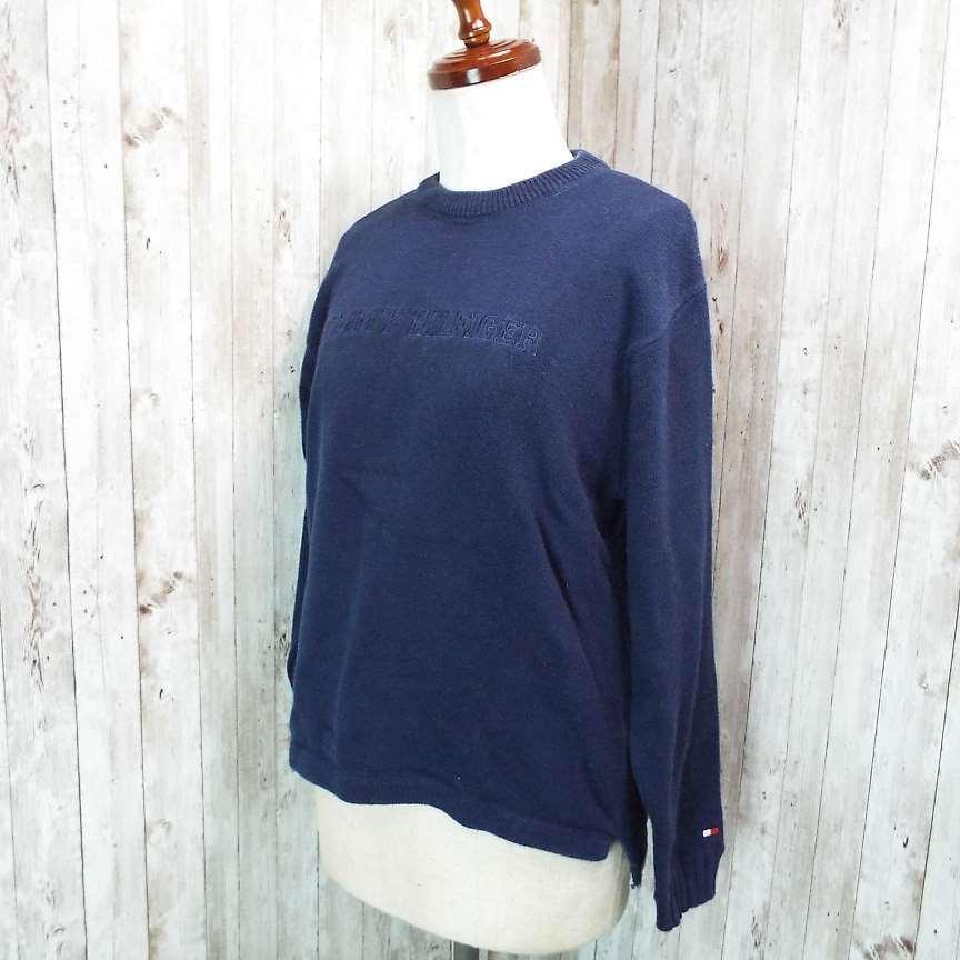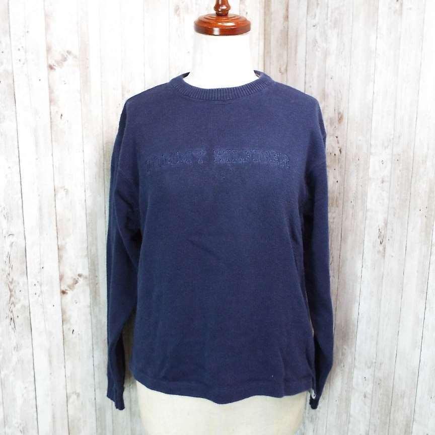 【アメリカ古着】TOMMY HILFIGER トミーヒルフィガー 胸ブランド刺繍ロゴ 長袖ニットセーター Lサイズ ネイビー コットン100%【湘南倉庫】レディースブランド古着