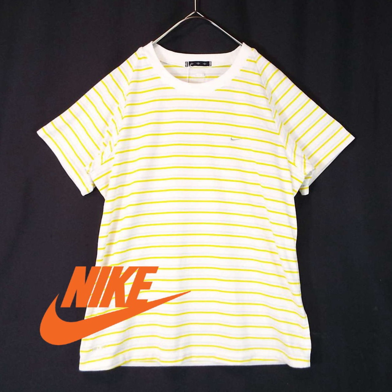 【身幅44cm】NIKE(ナイキ) ボーダー柄 半袖Tシャツ(トレーニングウェア)XLサイズ(170/92A) ホワイト・イエロー コットン・ポリエステル(64/36)【湘南倉庫】レディースブランド古着 スポーツウェア